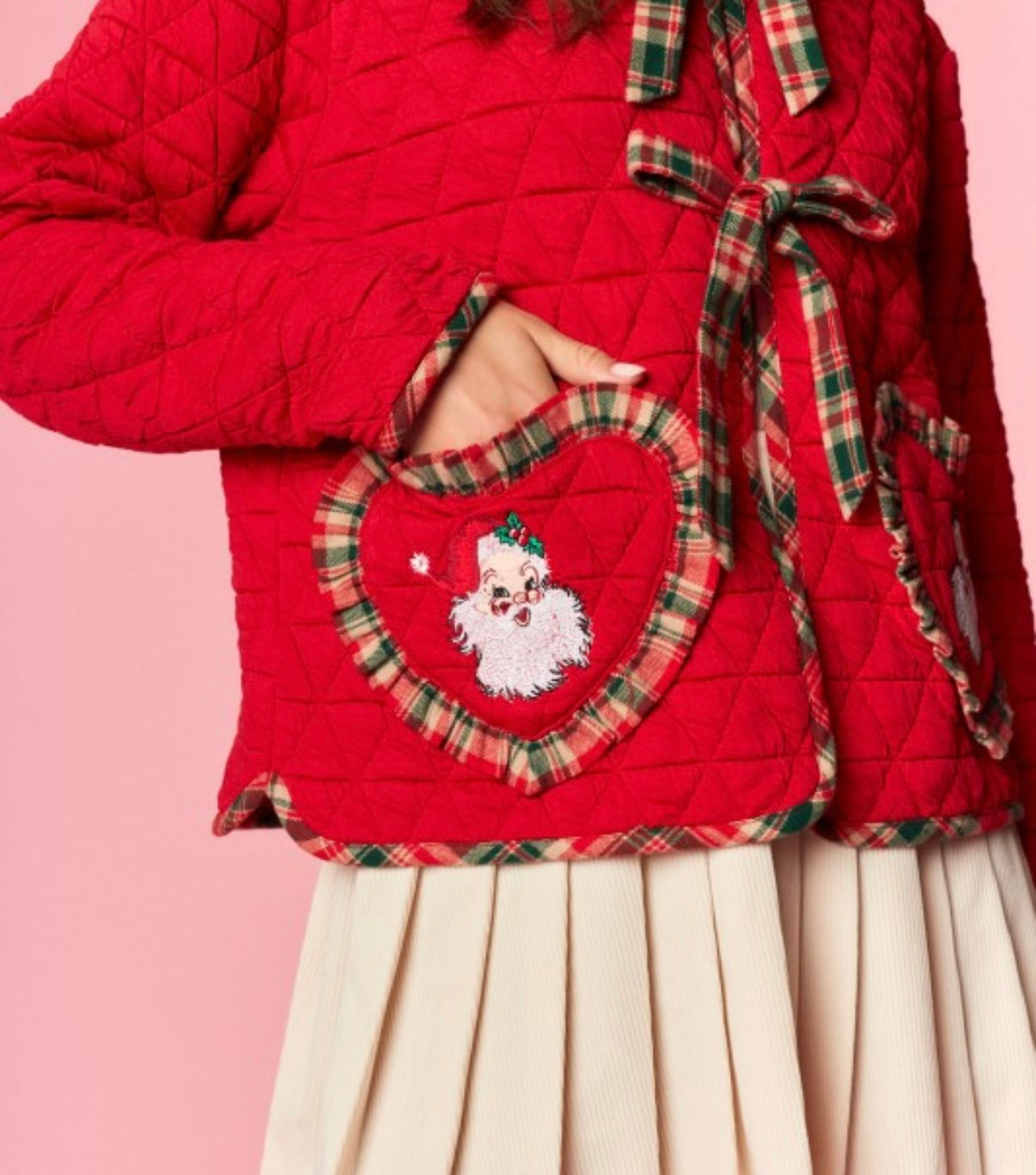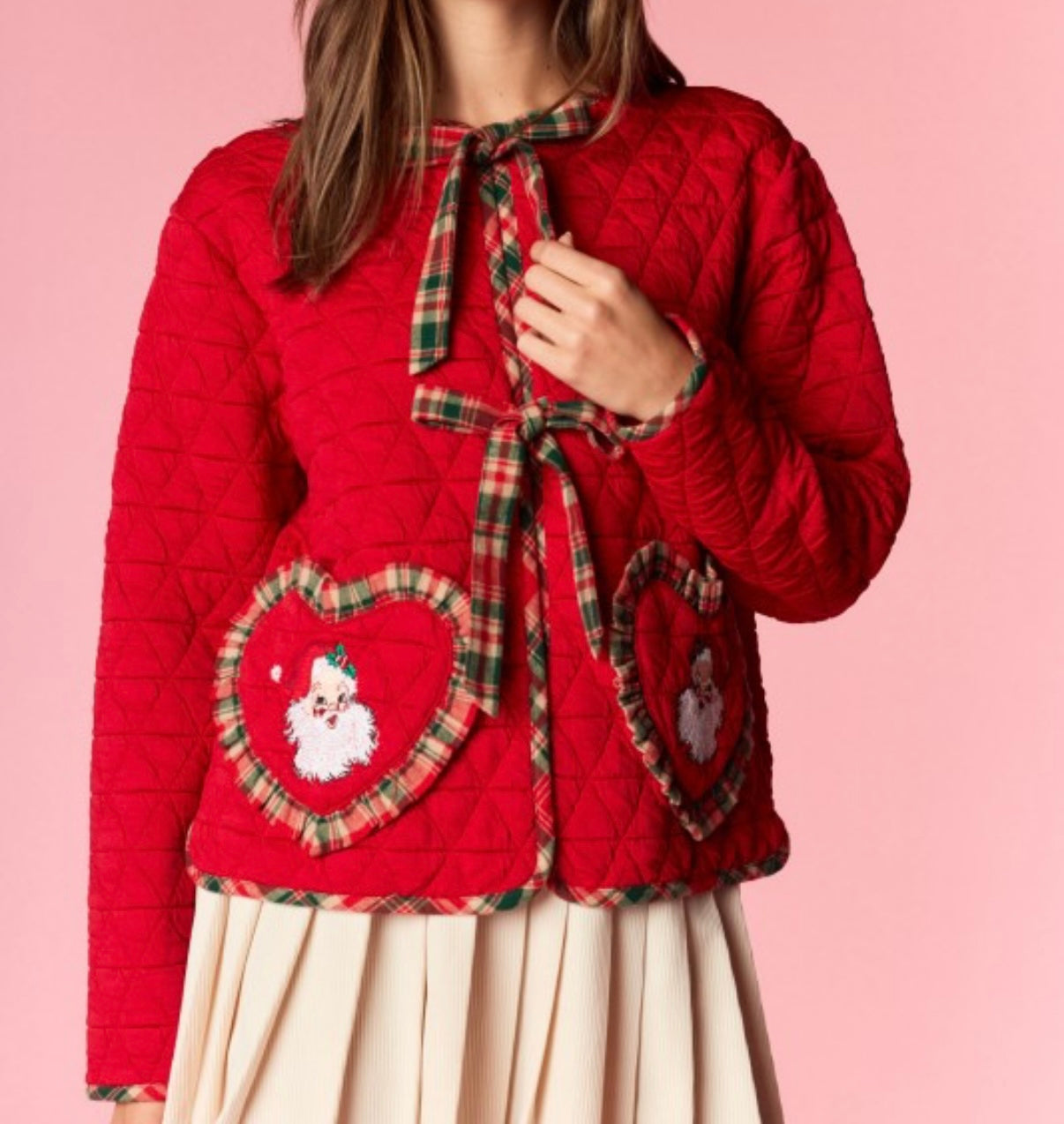 Relaxed quilted jacket in festive red. Plaid bow ties, heart shaped front pockets with embroidered Santa’s.